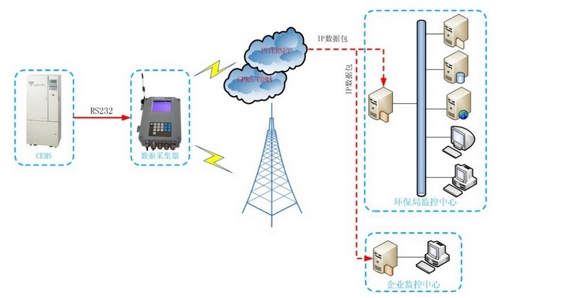 以K37環保數據采集器在某火電廠的應用為例,這個火電廠共有4個煙氣排放口,每個排放口安裝了一套CEMS煙氣連續在線監控系統和一臺K37數據采集器。CEMS通過RS-232通信接口連接到K37數據采集器的COM1。CEMS采集如下煙氣參數:煙氣流速、煙氣壓力、一氧化碳、氮氧化物、二氧化碳、二氧化硫、氧氣含量、含水量。K37同時與環保部門的污染源在線監控平臺和系統運營商的監控平臺通信,這樣運營商可及時了解現場數據和設備狀態,為系統的正常運行和及時維護提供了有效的手段。以下是系統框圖。