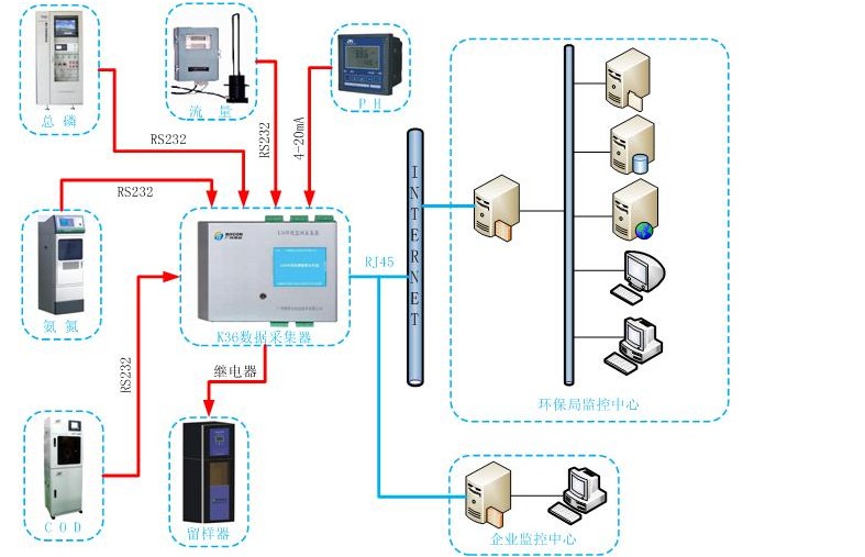 以K36在某污水處理廠的應用為例,這個污水處理廠在排放口共安裝了這幾種儀器:流量計、PH計、總磷在線分析儀、氨氮在線分析儀、COD在線分析儀、留樣器和K36數據采集器。其中流量計、總磷、氨氮、COD這幾種儀器帶有 RS-232通信接口,分別連接到K36數據采集器的COM1到COM4。PH計是 4-20mA輸出方式,連接到K36的AI01。留樣器由脈沖輸入觸發,將其觸發端連接到K36的R1繼電器上,在超標時由K36輸出觸發信號控制留樣器自動取樣一次。K36與污染源監控平臺的通信方式為VPN專網,與污水處理廠的監控系統通過本地局域網連接。以下是系統框圖。